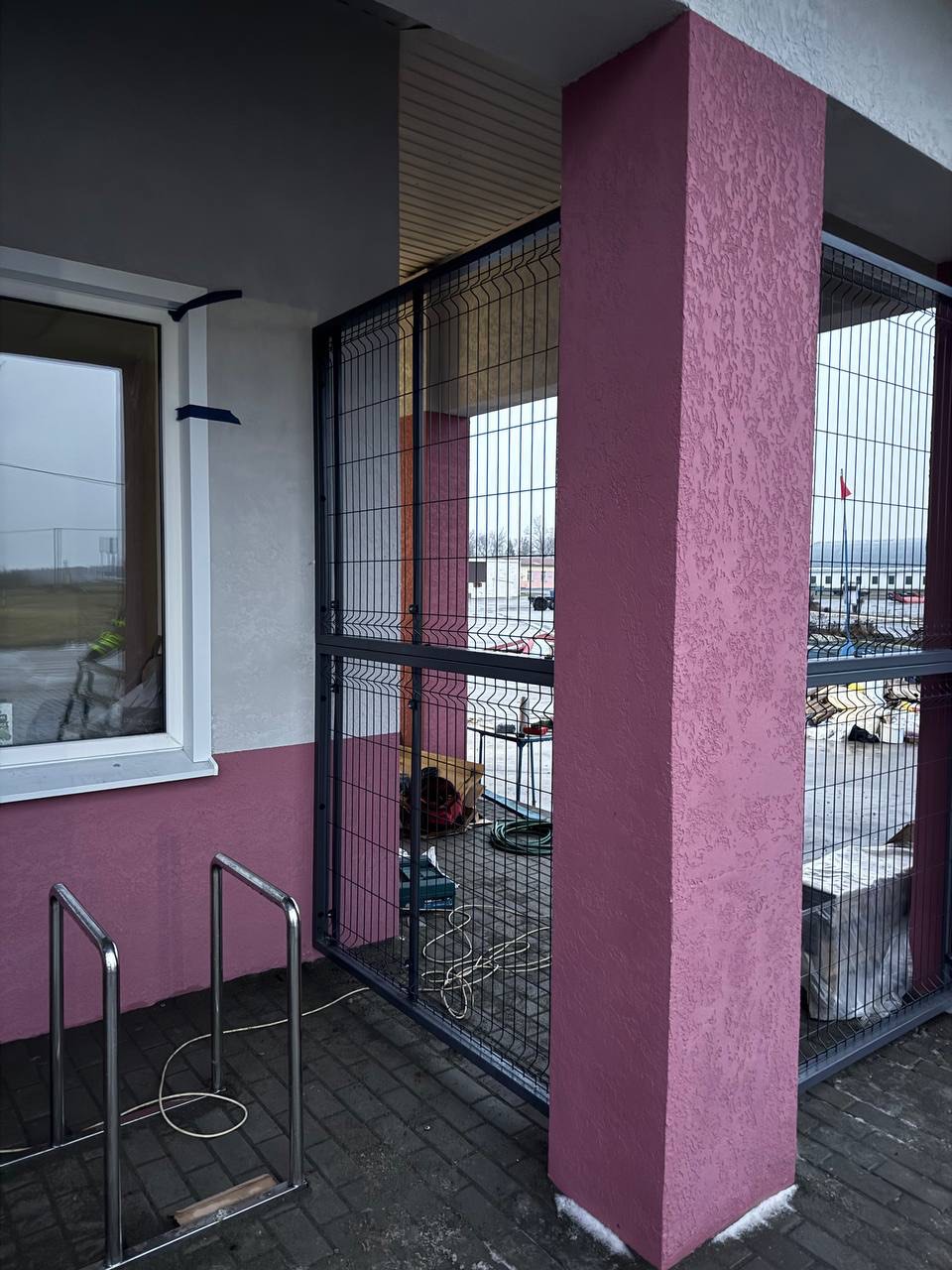 Для данного промышленного объекта под Минском использованы усиленные опорные столбы с профилем 80×80 мм, рассчитанные на эксплуатацию в интенсивных условиях. Увеличенное сечение стоек обеспечивает высокую жёсткость конструкции и устойчивость к ветровым нагрузкам, случайным ударам и ежедневной эксплуатации.