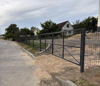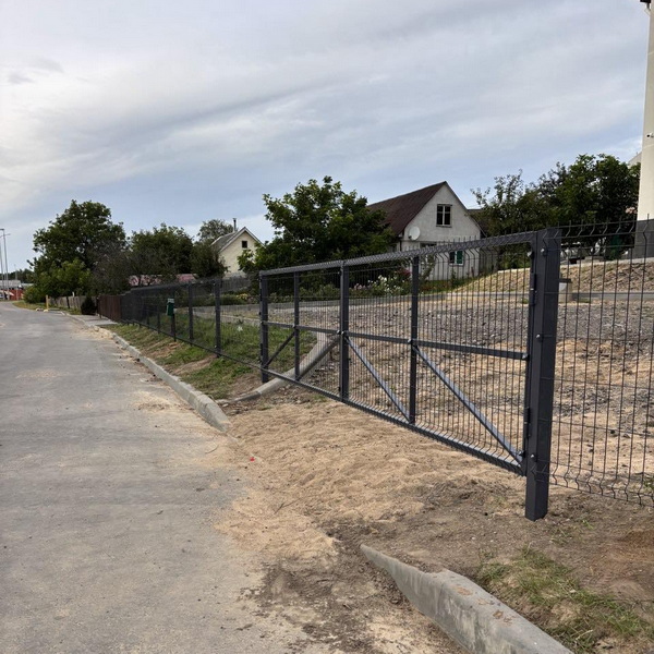Каркас ворот изготовлен из прочного металлического профиля, усилен стойками и фиксаторами, чтобы обеспечить плавное открывание даже при длительной эксплуатации. Верхняя часть ворот может быть продолжением 3D‑панели или оформлена в едином стиле с забором, что создает цельный и аккуратный внешний вид периметра.