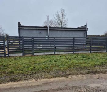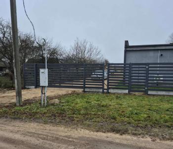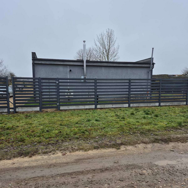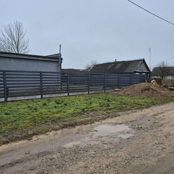 В этом проекте мы реализовали ограждение для частного дома с откатными воротами, калиткой и забором из штакетника по горизонтали в один ряд. Общая длина забора составляет 35 метров, конструкция выполнена в графитовом цвете, дополнена армированным бетонным цоколем и автоматикой ворот. Такое решение сочетает современный дизайн, надежную защиту и удобство эксплуатации для владельца загородного участка.