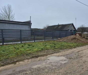 Общая длина забора из горизонтального штакетника составляет 35 метров, что позволяет оградить входную часть участка, зону парковки и прихожую территорию. Такого периметра достаточно, чтобы создать ощущение защищенности, не закрывая полностью двор и сад, а оставляя пространство визуально открытым.