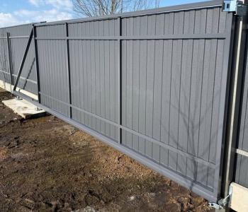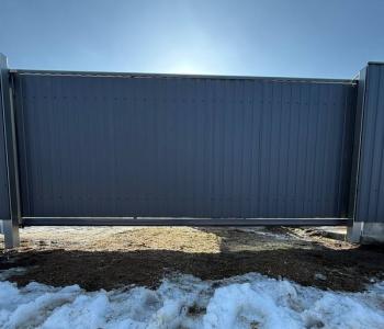 Откатные ворота 5 метров спроектированы как прочная, но при этом легкая конструкция. Каркас изготовлен из профильной трубы, зашивка — из металлопрофиля, который устойчив к коррозии и перепадам температур. Автоматики на данном этапе не предусмотрено, ворота открываются и закрываются вручную при помощи ручки, что снижает стоимость и сервисные расходы.